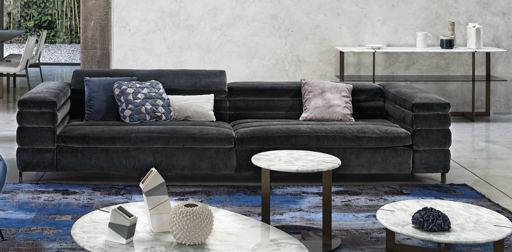 Struktur aus Holz mit Polsterung aus Polyurethan-Schaumstoff und Gänsedaunen. Bezug aus Samtstoff oder Echtleder in verschiedenen Farbausführungen. Füße aus Metall in Glimmerig Braun gebeizt, Oxy Grey gebeizt, Titan oder Messing. Nur der Sitzbezug ist abziehbar.