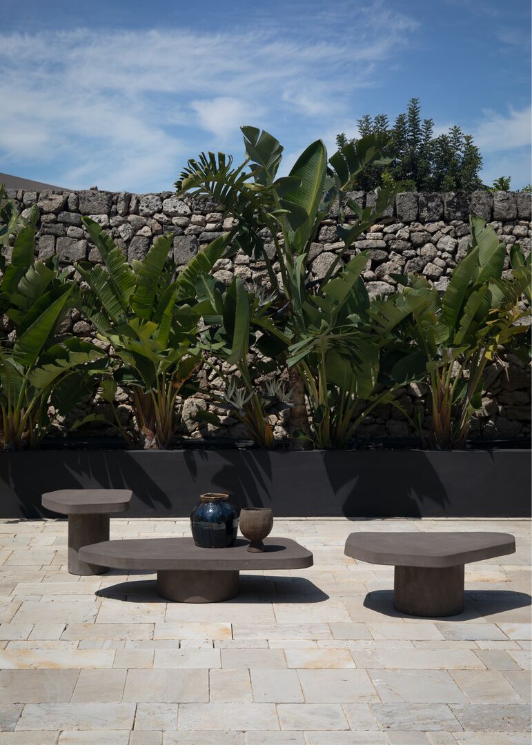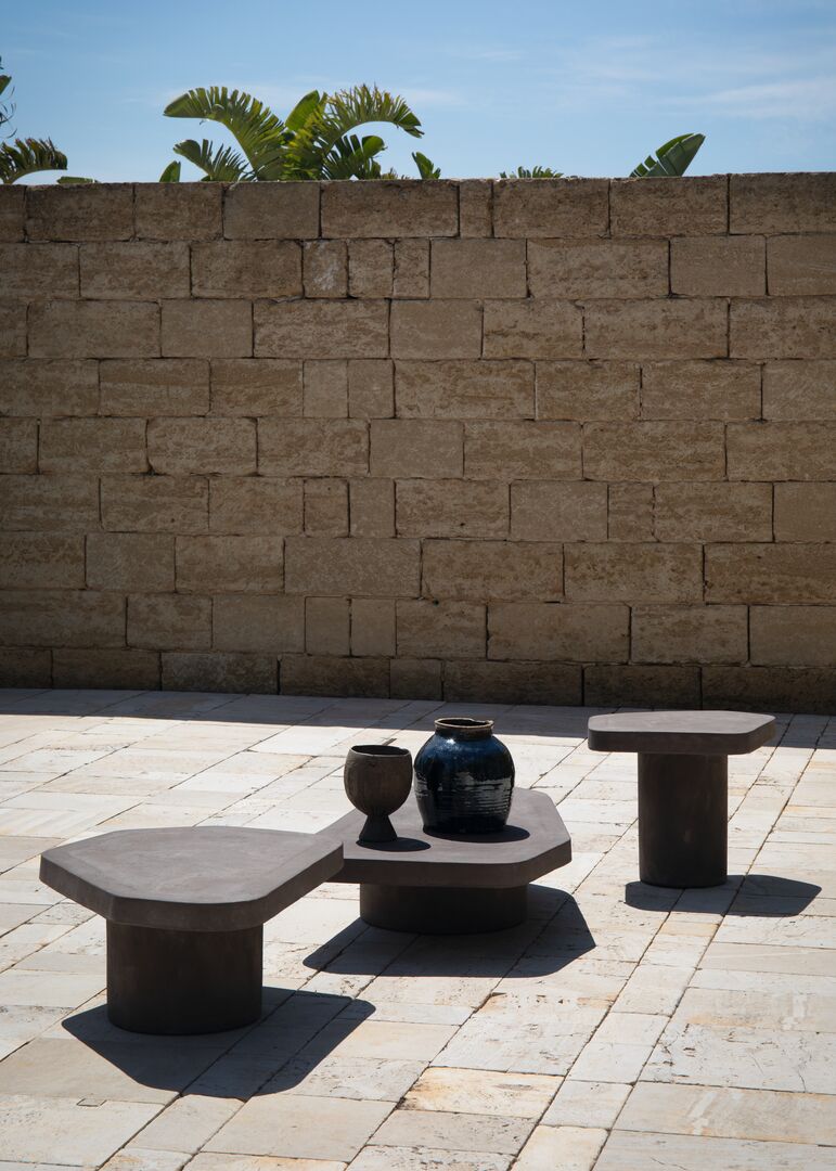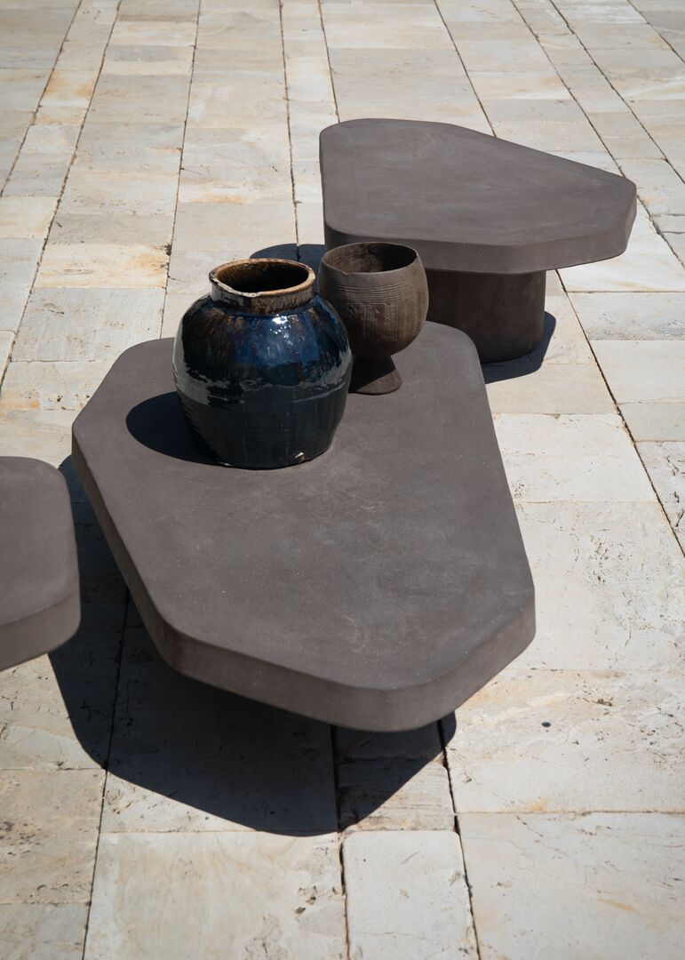 der Zeit entwickeln und den Jahreszeiten trotzen. Jeder Beistelltisch wird aus grauem Terrakotta hergestellt, das