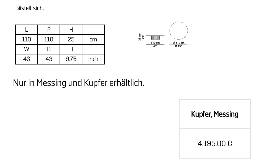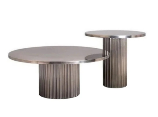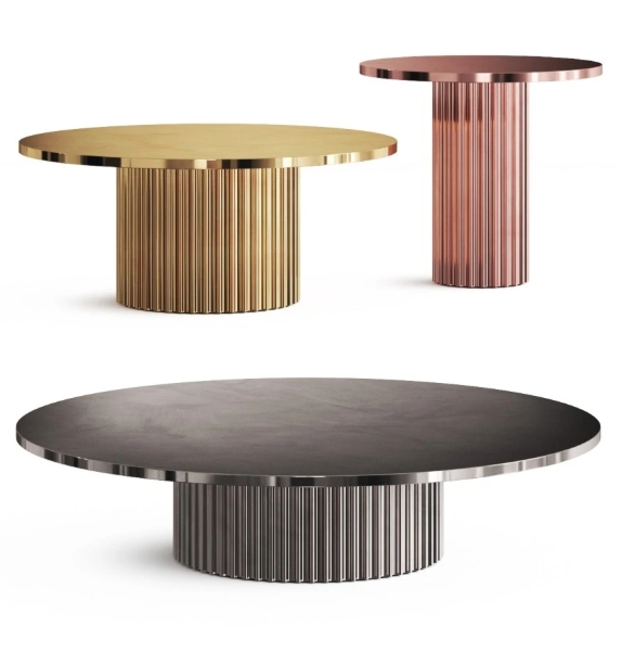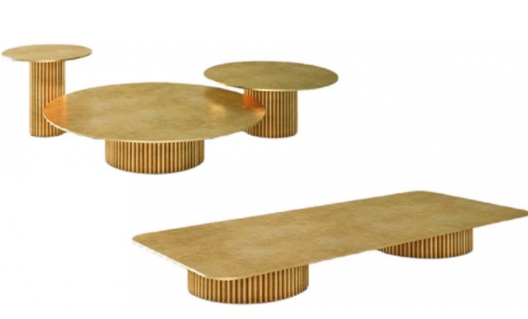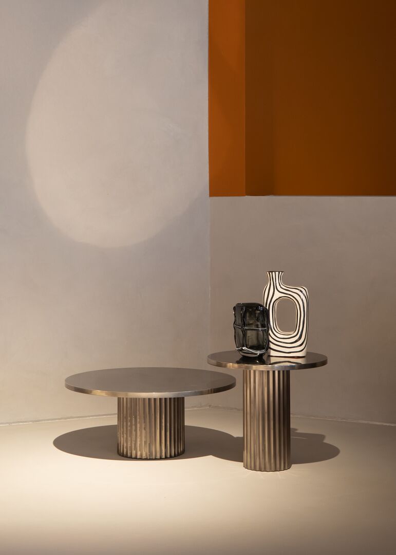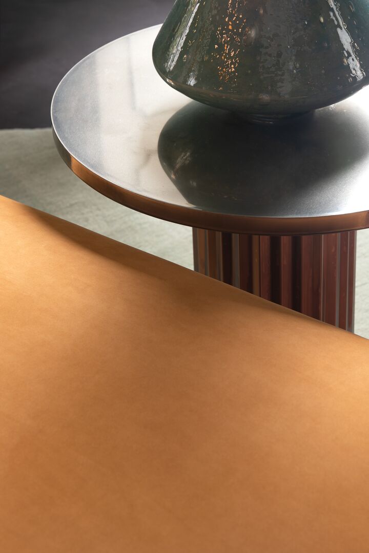 Allure ist der Beistelltisch aus Metall, der den Wohnraum mit einer ausgewogenen Kreis-Interpretation in drei verschiedenen Maßstäben bereichert und diese mit einem einzigen Rechteck-Konzept ausbalanciert. Die eher konventionellen geometrischen Formen für Wohnzimmermöbel finden hier eine zeitgemäße, unerwartete Interpretation, die zum Spiel mit den Sinnen einlädt. Unter der Metallplatte in Antik-Optik mit glänzenden und matten Nuancierungen spiegeln sich in dem plissierten Sockel dorische Säulen mit einer funktionellen und stabilen Strenge wider, die aus der Nähe auf die konzeptionelle nordeuropäische Architektur des 20. Jahrhunderts verweist.