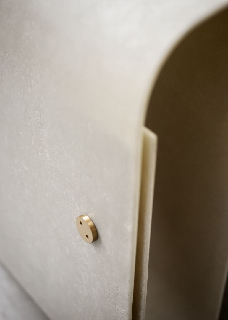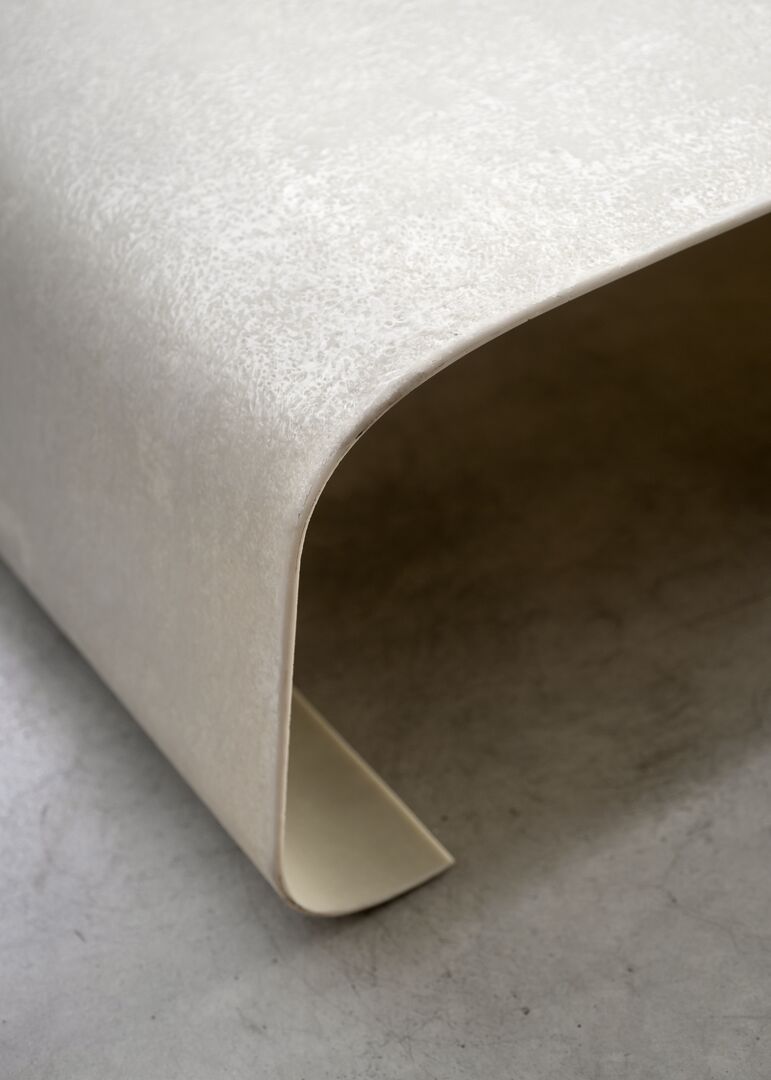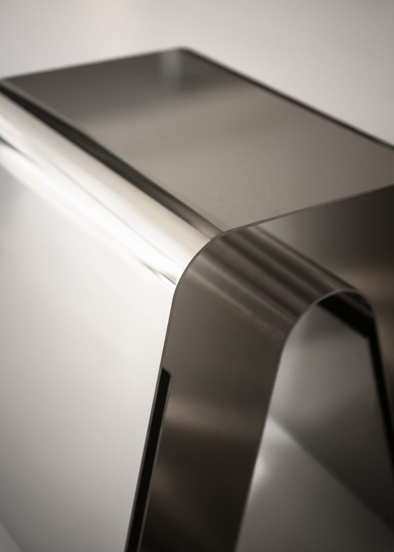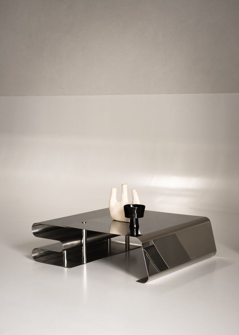 Der experimentelle und ironische Beistelltisch Dune von Draga & Aurel besteht aus einem gewundenen Band aus Edelstahl, das außen glänzend und innen satiniert ist. Er ist in zwei Versionen erhältlich: Stahl oder natürliches Fiberglas, mit Details aus satiniertem Messing oder verchromtem Metall. Ein skulpturales Stück, dessen dünnes Blech das Licht wie ein Spiegel reflektiert und so auf Schritt und Tritt funktionale Tischplatten für einen Beistelltisch und einen Nachttisch schafft.