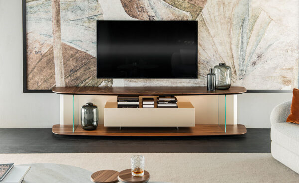 TV Träger mit Struktur und Schubladen lackiert titan (M11) oder bronze (GFM18) gaufriert und Seiten in Glas extra hell transparent mit facettierten Kanten. Platte und Boden mit schrägen Kanten aus Nussbaum Canaletto (NC) mit Einsätzen in verbrannte Eiche (RB) oder aus verbrannte Eiche (RB) mit Einsätzen in Nussbaum Canaletto (NC).