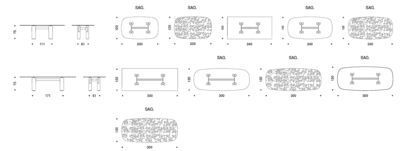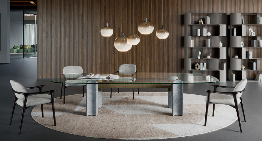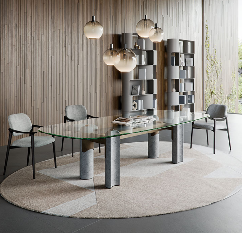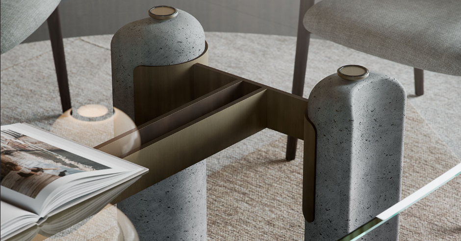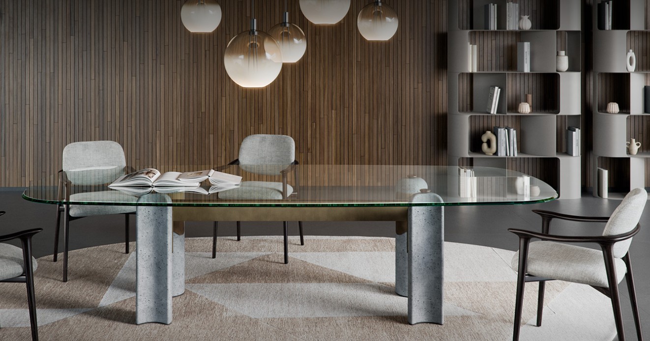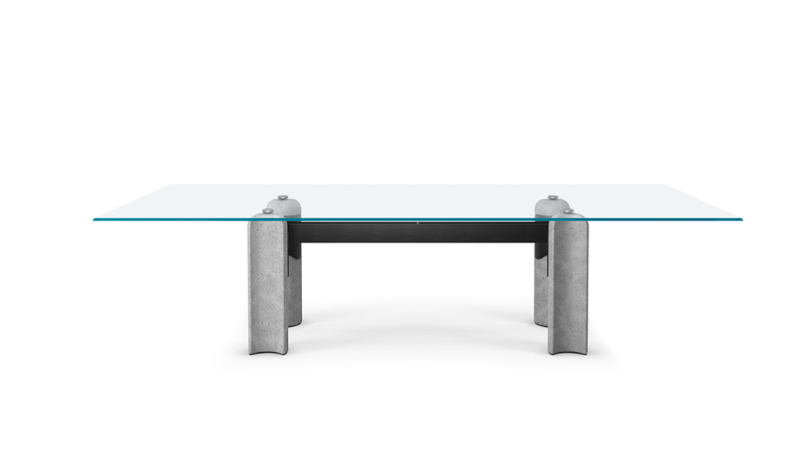 Das vom Brutalismus inspirierte Design nimmt im Modell Bilbao Glass, einem Tisch mit Beinen aus Beton, Gestalt an. Das Untergestell besteht aus vier Säulen aus Leichtbeton mit halbmondförmigem Querschnitt, die durch eine Struktur aus Metall miteinander verbunden sind.