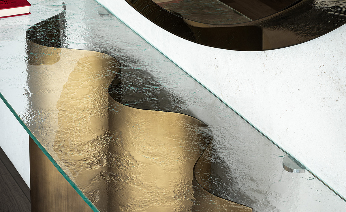 Wie die Designerin Margherita Fanti sagt, ist die moderne Konsole Nettuno eine Erforschung fließender Formen, weicher und kontinuierlicher Kurven. Er ist von der Natur inspiriert, insbesondere von einem ihrer vielen Beispiele für Perfektion: den Wellen. Der gewundene Sockel ist so gestaltet, dass er sein Aussehen je nach Blickwinkel verändert. Volle und leere Zylinder tauschen ihre Plätze, Licht und Schatten wechseln sich ab, wenn man diese Design-Konsole aus verschiedenen Blickwinkeln betrachtet. Nettuno ist also schlank und imposant zugleich, vor allem, wenn Sie sich für die von erfahrenen Handwerkern freihändig gebürstete Version der Linie Brushed entscheiden. Das geschwungene Metallgestell ist aus einem Stück gefertigt und wertet diese Glas-Konsole.