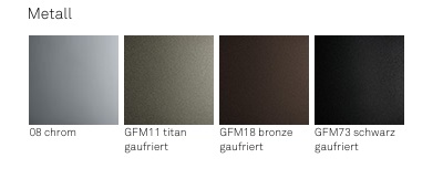 Stuhl mit verchromtem (08) Stahlgestell oder aus Stahl lackiert titan (GFM11), bronze (GFM18) oder schwarz (GFM73) gaufriert. Bezug aus Stoff, micro Nubuck, Softleder oder Kunstleder laut Musterkarte. Nicht abziehbar.