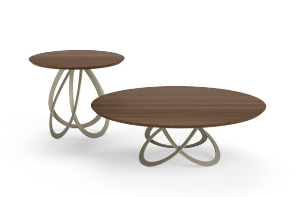 Febe Low mit Holzplatte ist der raffinierte Couchtisch, der gut in moderne und elegante Umgebungen passt und sofort die aufmerksamsten Blicke auf sich zieht. Dieses originelle Dekorationselement passt perfekt in Kontexte mit warmen Tönen. Design Moom hat es mit einem runden Regal aus furniertem Holz mit 20 mm dicken schrägen Kanten entworfen, das von einem interessanten, einfarbig lackierten Metallsockel getragen wird. Die Struktur an der Basis ist die eigentliche Besonderheit dieses Einrichtungsaccessoires: Drei große Metalltropfen verflechten sich gekonnt zu einem leichten Dekor, wie eine Rose. Der raffinierte Couchtisch von Eforma verfügt über runde Platten in verschiedenen Größen und ist auch in den Versionen Keramik, Kristall und Marmor erhältlich.