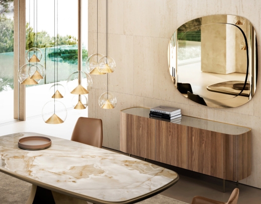 Die dreidimensionalen und abgerundeten Glasränder erinnern an die unregelmäßigen Formen der Tunnel entlang der Dolomitenpfade, von denen sie inspiriert sind.