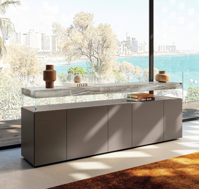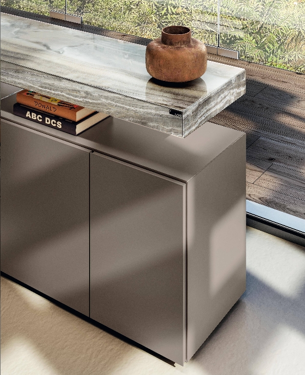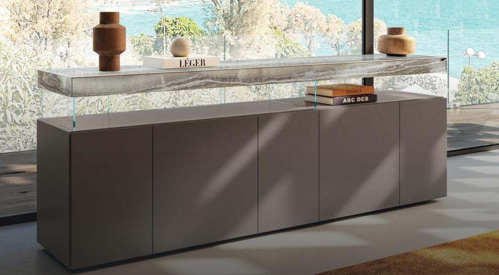 Das Air-System wurde um ein modernes Sideboard erweitert, das mit dem Kontrast von Masse und Leere spielt und die üblichen Ordnungsmuster umkehrt: Das Möbelstück scheint in der Luft zu schweben, gestützt von transparenten Platten aus gehärtetem Glas, die einen überraschenden Schwebeeffekt erzeugen.