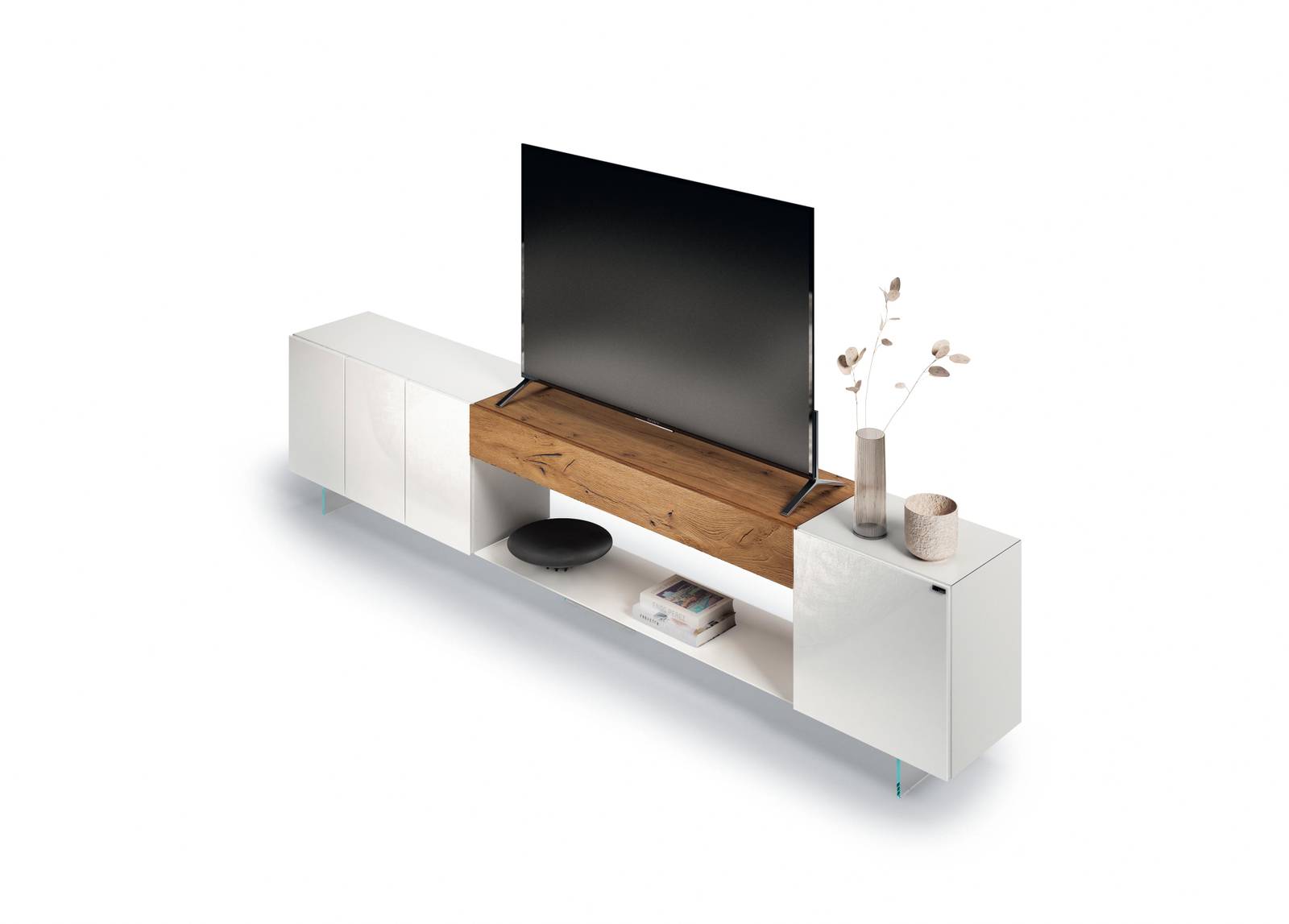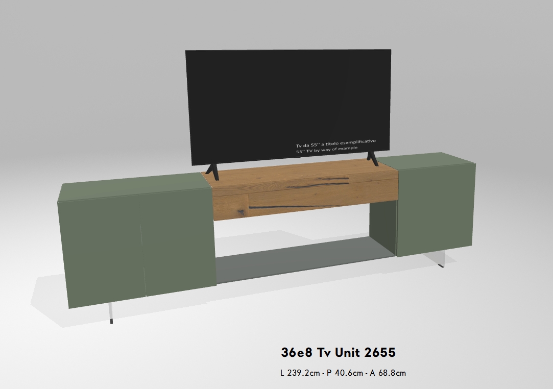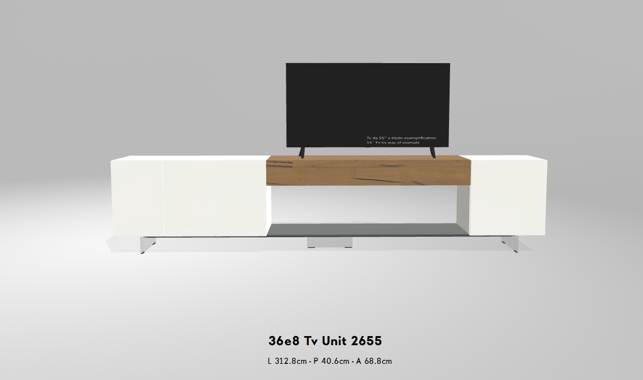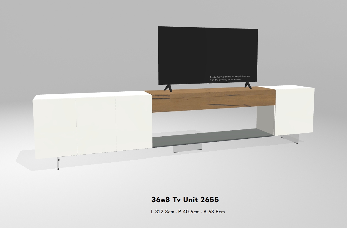 Das 36e8 TV-Möbel ist sowohl als Einzelmodul als auch als Teil einer komplexeren Wohnlösung erhältlich. Dank seines modularen Aufbaus lässt sich das Design frei und individuell nach Ihren Bedürfnissen gestalten.