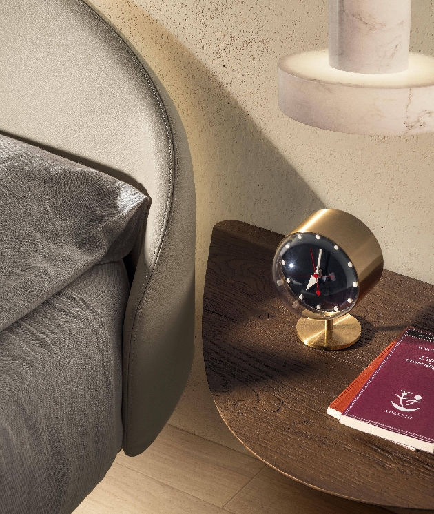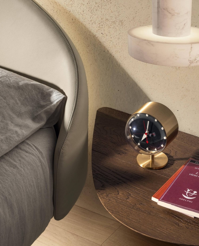 Ergänzt wird das runde Hängebett durch organisch geformte Nachttische, wahlweise in Wildwood oder Glas, die Funktionalität und Eleganz perfekt verbinden.