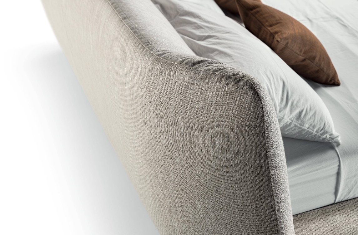 Die hochwertige Verarbeitung, präzise Nähte und die ausgewogene Polsterung unterstreichen die hohe Qualität dieses modernen Polsterbettes. Die leichte, dynamische Formensprache wird durch die originelle, nach außen gestellte Linienführung am unteren Bettende ergänzt und verleiht dem Design eine zeitgemäße Eleganz.
