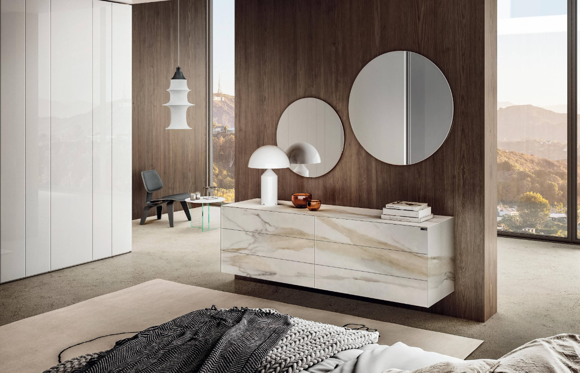 Die funktionalen Stauraummöbel für das Schlafzimmer können entweder wandhängend oder auf Metallgestellen aus Titanio Steel oder Peltro Steel montiert werden und verleihen jedem Schlafzimmer eine stilvolle und moderne Ausstrahlung.