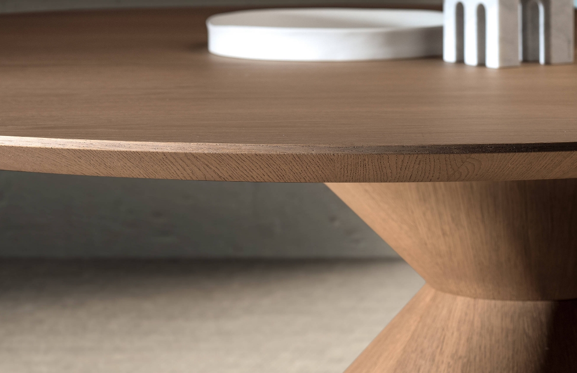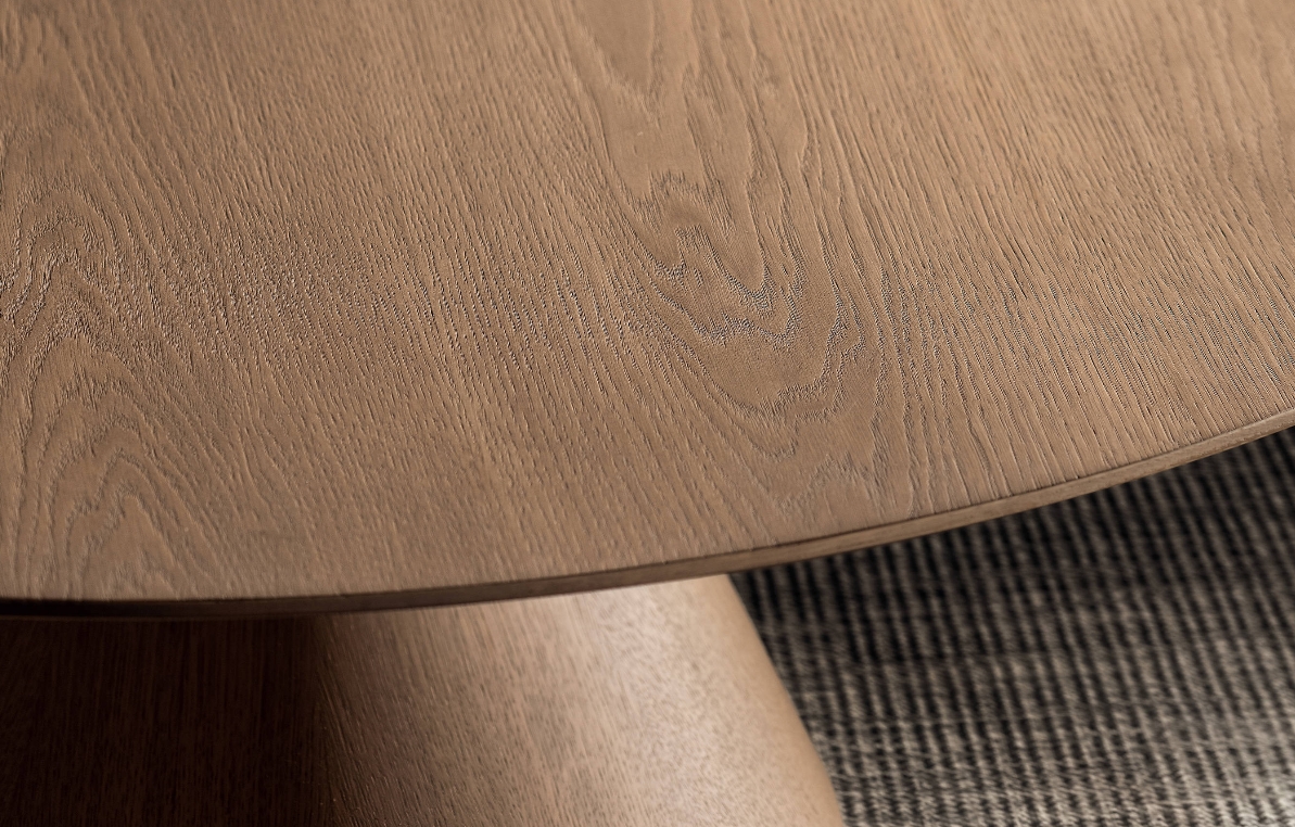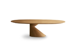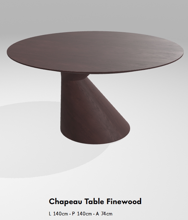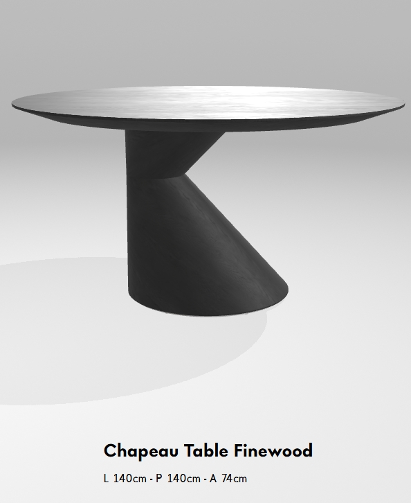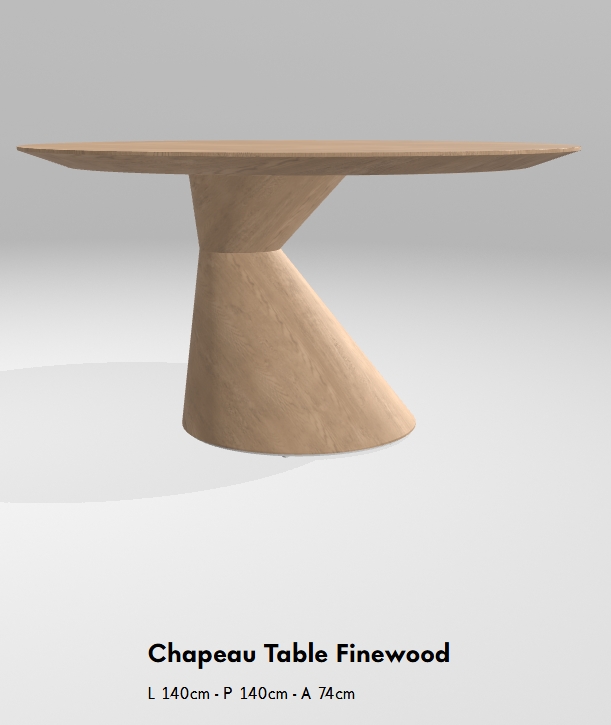 Das markante Design und die starke optische Präsenz der Basis verleihen dem Chapeau Tisch seinen charaktervollen Ausdruck und schaffen Dynamik im Raum. Der Kragarm-Effekt der Tischplatte in Verbindung mit der skulpturalen Basis verleiht dem Tisch eine überraschende Leichtigkeit, bei gleichzeitig maximaler Stabilität.