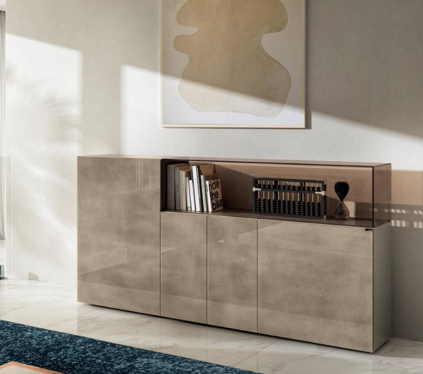 Sideboard aus titanfarbenem Glas mit eleganten Oberflächen, die das Licht reflektieren und die Umgebung aufhellen.
