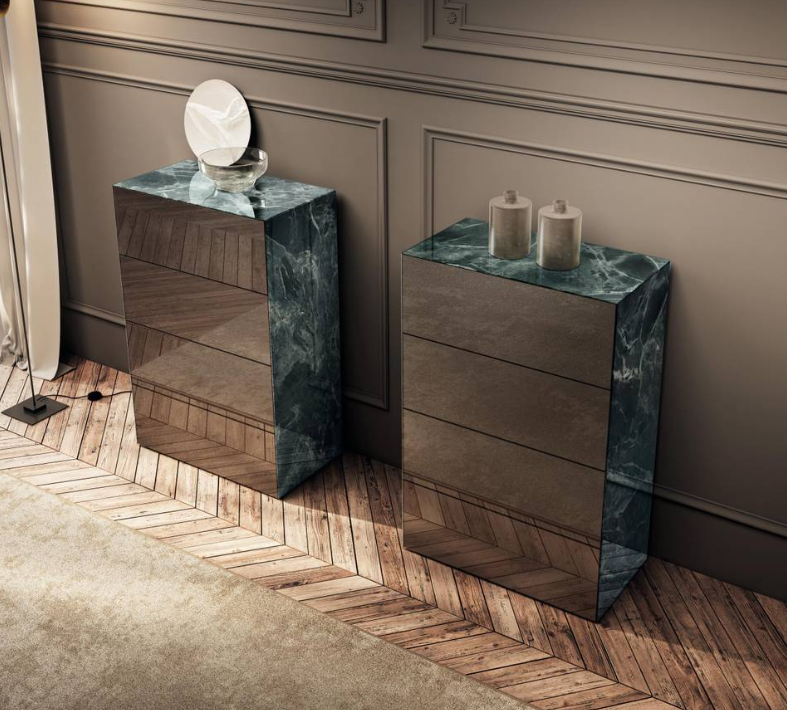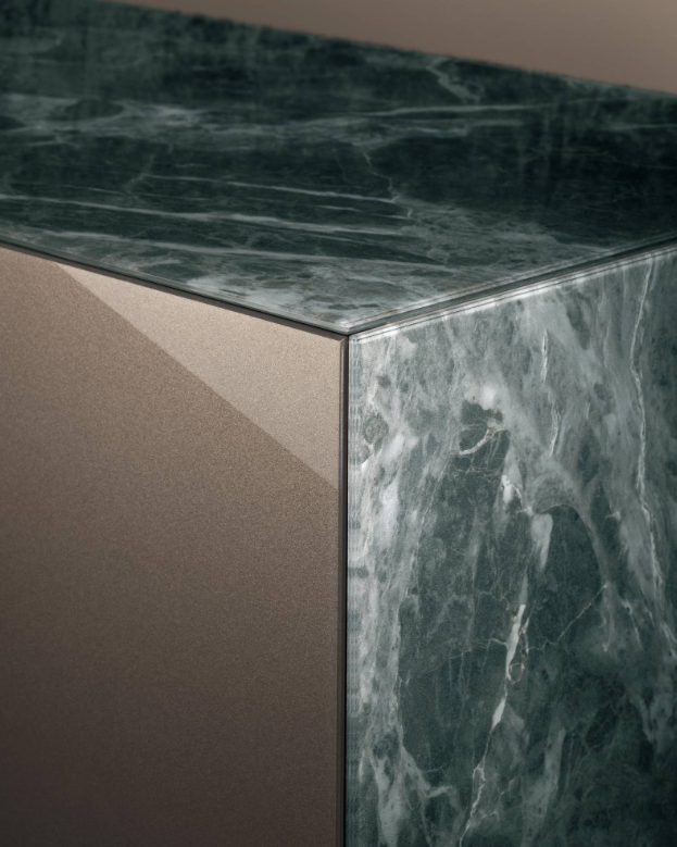 Eine elegante, durchgehende Maserung und Struktur veredeln die Oberflächen der modernen Materia-Kommoden. Holz, Marmor, Metall oder Stoff werden mithilfe der revolutionären XGlass-Technologie auf Glas gedruckt. Als funktionale Stauraummöbel für das Schlafzimmer – wahlweise wandmontiert oder auf Metallgestellen aus Titanio Steel oder Peltro Steel – verleihen sie jedem Schlafzimmer eine stilvolle Note.