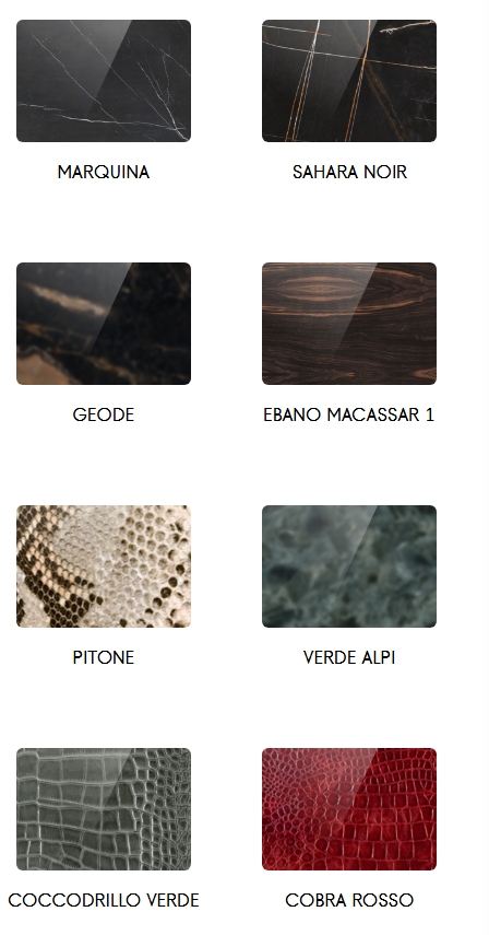 Wählen Sie aus XGlass-Oberflächen in Marmor-, Metall-, Holz- oder Stoffoptik, deren durchgehende Maserungen und Strukturen die ursprünglichen, natürlichen Eigenschaften der Materialien hervorheben – erhältlich sowohl in matter als auch in polierter Ausführung.