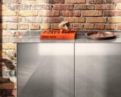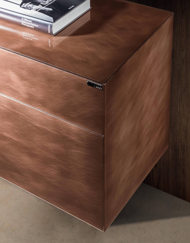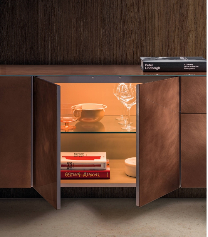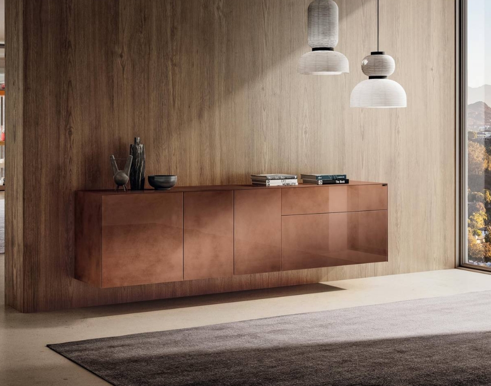 Das Materia Sideboard zeichnet sich durch ein klares, lineares Design aus, das von 4 mm starkem Glas geprägt ist. Dieses ist äußerst widerstandsfähig und erzeugt eine präzise, brillante Oberflächenwirkung, die dem Möbelstück besondere Lebendigkeit verleiht. Ob wandhängend montiert oder auf eleganten Metallfüßen stehend – das Sideboard lässt sich nahezu unbegrenzt individualisieren.