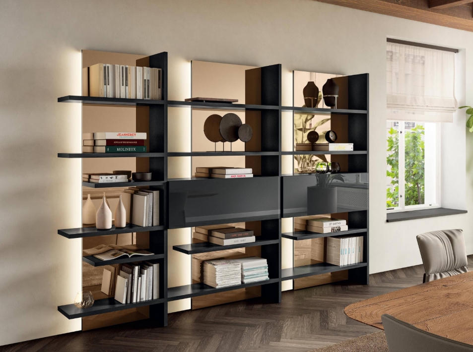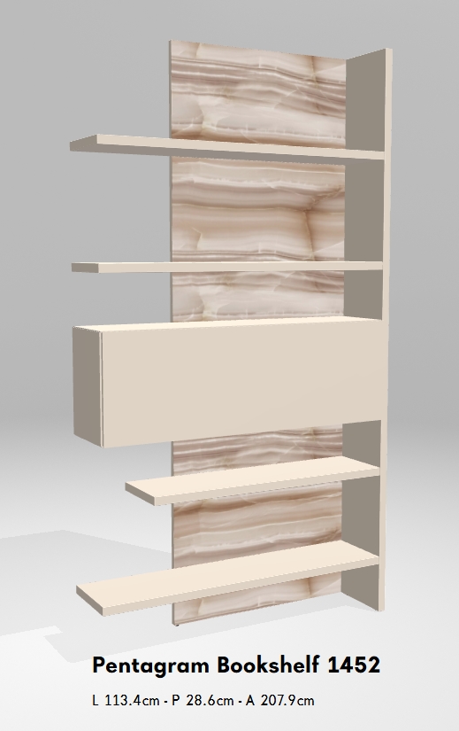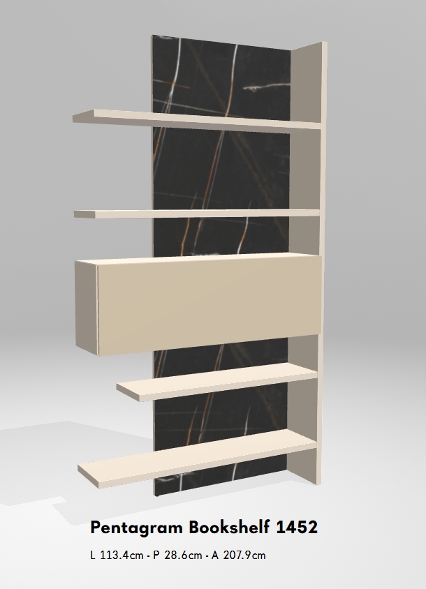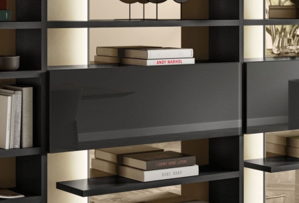 Wie eine Partitur, die den musikalischen Rhythmus vorgibt, entfaltet sich das modulare Bücherregal Pentagram an der Wand und prägt so den Rhythmus des Raumes. Minimalistische Regalböden ragen aus der Rückwand hervor und erzeugen eine dynamische und zugleich leichte Optik. Der Eindruck des Schwebens wird durch die in die Rückwände integrierte Beleuchtung verstärkt, die mit außergewöhnlichen visuellen Elementen aus XGlass, farbigem Glas und Lackoberflächen verziert ist. Mit drei Elementen in unterschiedlichen Breiten – drei für die Standmontage und drei für die Wandmontage – lassen sich die Regale einfach und flexibel kombinieren, um individuelle Arrangements zu gestalten. Das Standmodell des Pentagram Bücherregals kann mit praktischen Aufbewahrungseinheiten ausgestattet werden, die die unten angeschlagene Türöffnung optimal nutzen und so einen Schreibtisch für das Homeoffice schaffen.