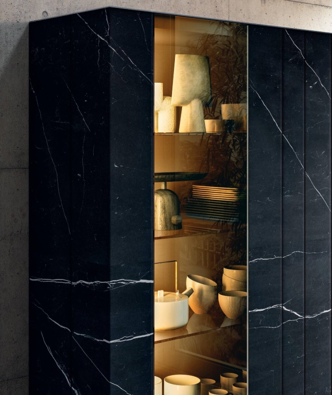 Besonders charakteristisch für die Lago-Kollektionen ist der Einsatz von hochwertigen Materialien: Poliertes Glas, Matt- oder XGlass-Oberflächen, Wildwood-Holz und feine Metall-Akzente verleihen den Möbeln eine edle, lebendige Anmutung. Dank der push-to-open-Öffnungen bleibt die Oberfläche puristisch und klar – ganz ohne sichtbare Griffe.