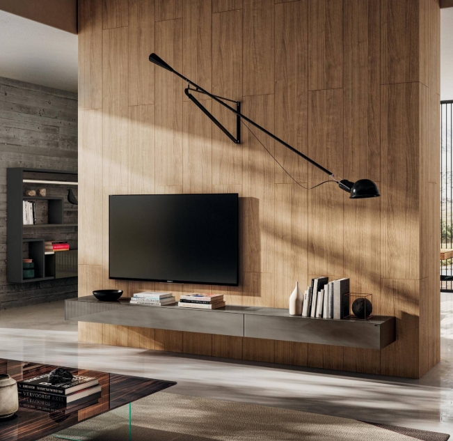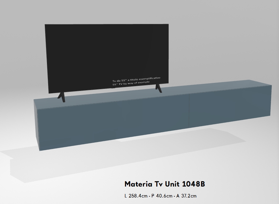 Das Materia TV-Möbel kann wahlweise an der Wand montiert oder auf Metallstützen in Titanio Steel oder Peltro Steel ausgeführt werden.