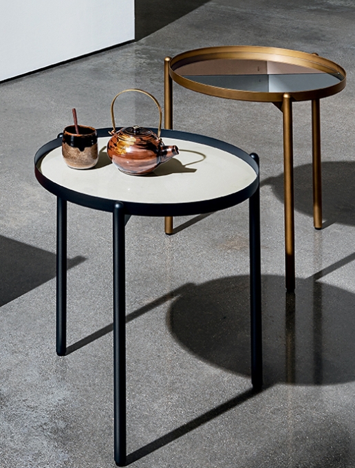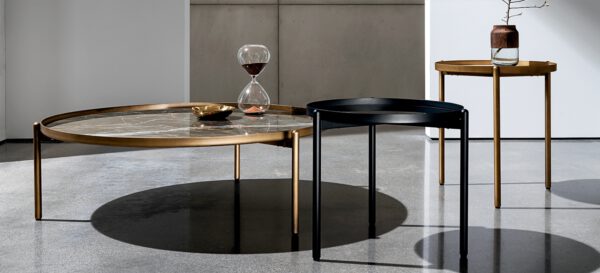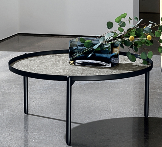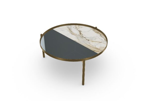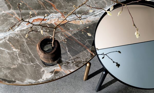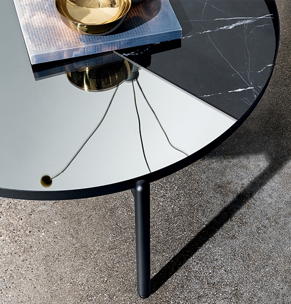Die Campos-Kollektion wird nun um eine Reihe von Couchtischen erweitert, die sich durch das grafische und minimalistische Design der Struktur auszeichnen. Die Kombination aus Keramik und Spiegel für die Tischplatte schafft eine raffinierte Balance für die zeitgenössische Einrichtung.