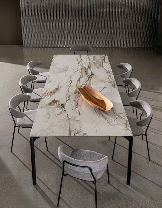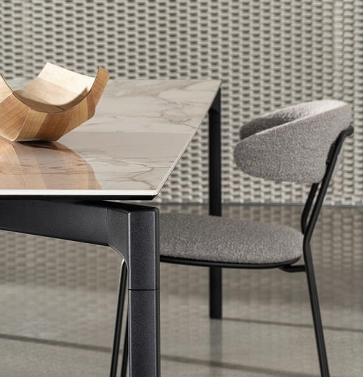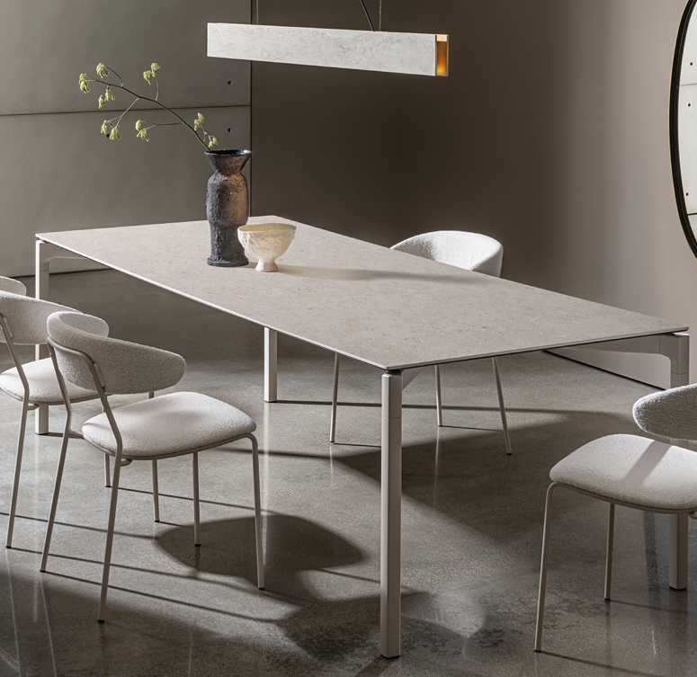 Esstisch mit Beinen und Struktur aus Aluminium, in verschiedenen Ausführungen.