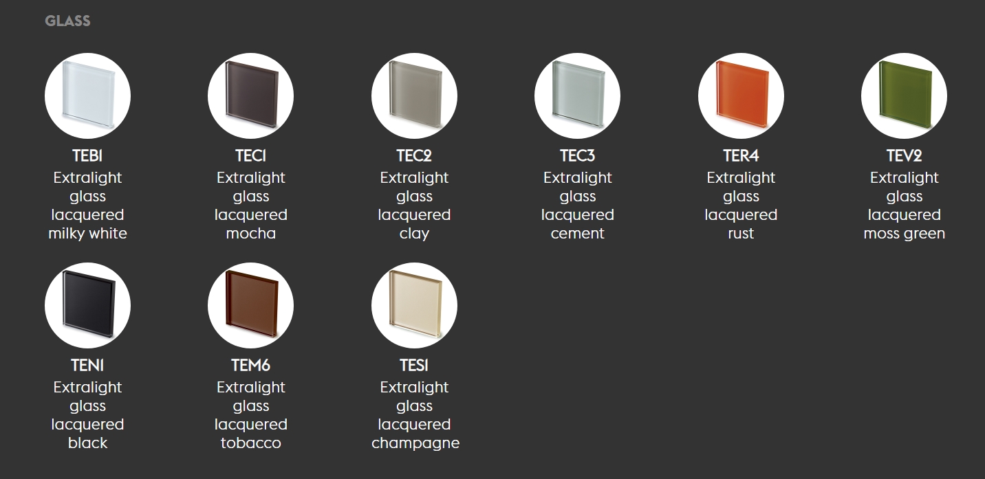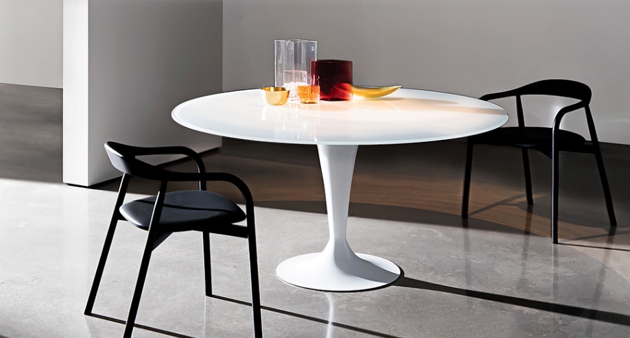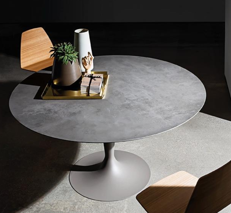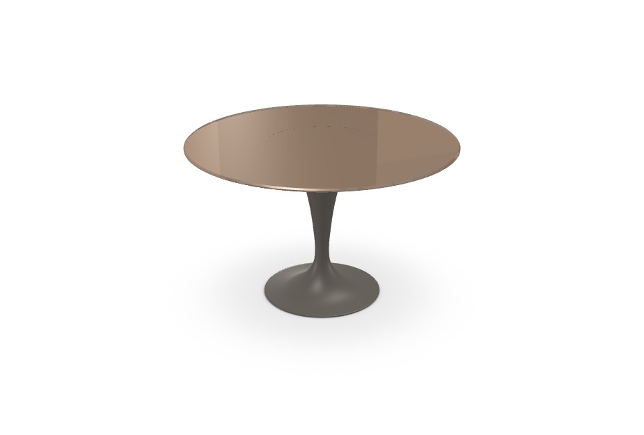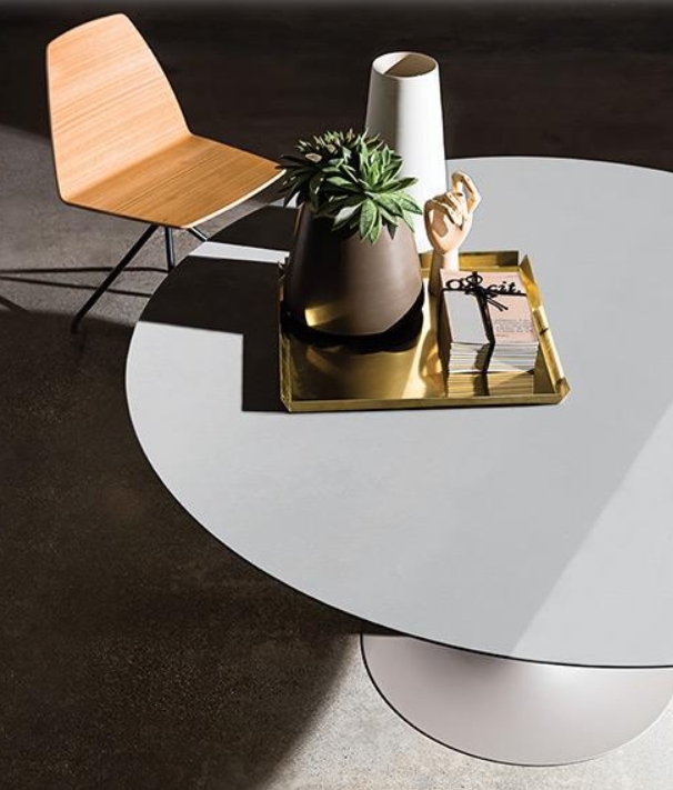 Esstisch mit verchromtem oder lackiertem Metallgestell in verschiedenen Ausführungen. Tischplatte aus gehärtetem Glas, MATERIA oder Keramik in verschiedenen Oberflächenausführungen erhältlich.