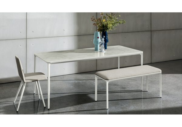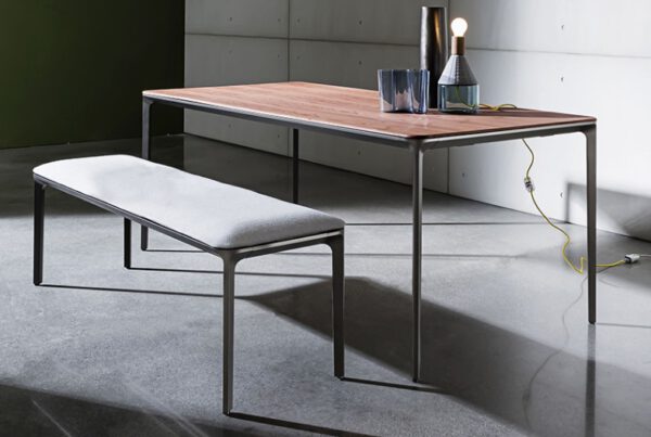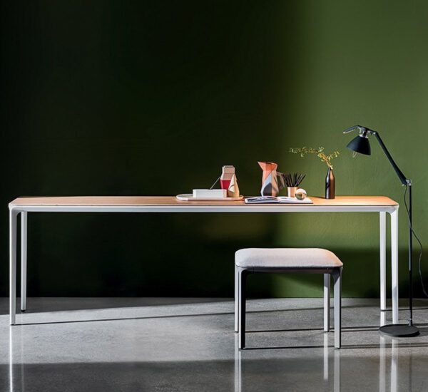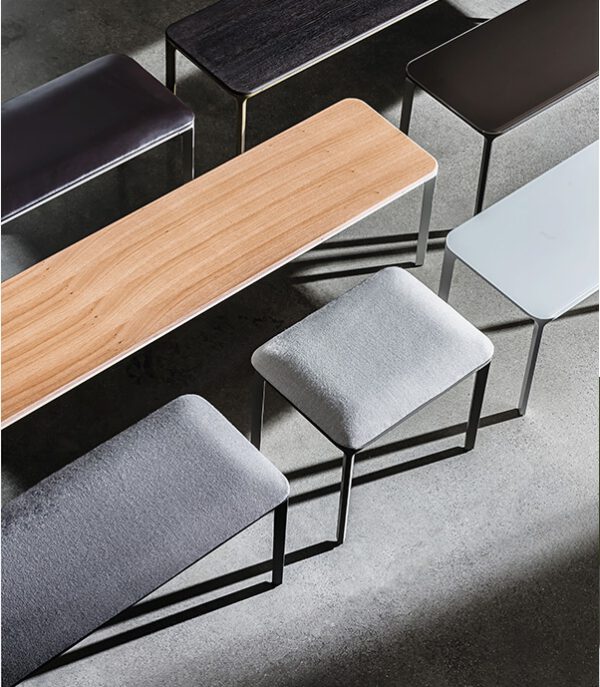Slim ist eine Bank, die von Matthias Demacker für Sovet . Er hat Beine aus verchromtem oder lackiertem Aluminiumdruckguss, verschiedene Ausführungen und eine Struktur mit eloxiertem oder lackiertem Aluminiumprofil, verschiedene Ausführungen. Sitz aus Holz oder gepolstert mit KVADRAT-Stoff, Leder, Kunstleder oder Nabuk-Kunstleder.