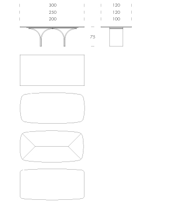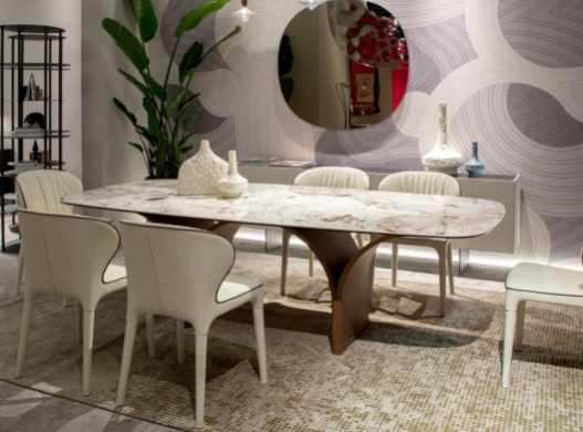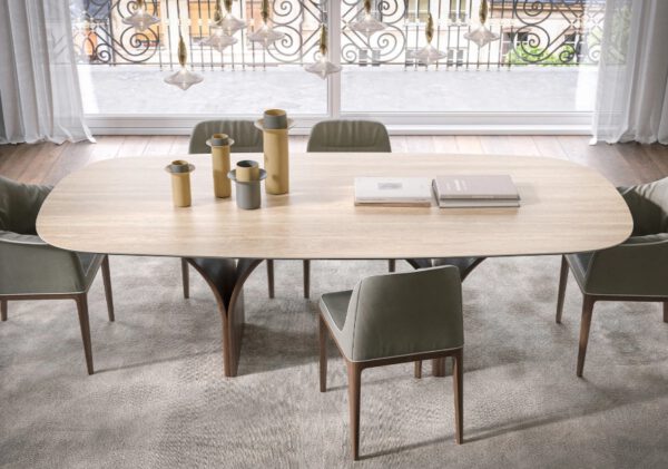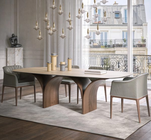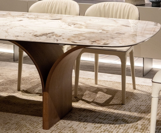 Zarte, geschwungene Holzbeine tragen Arco, einen Tisch mit einer Platte aus Feinsteinzeug in der neuen Ausführung Tundra. Ein Designelement von großer Ausgewogenheit und Harmonie, das jede Umgebung mit Eleganz bereichert. Die Platte ist in verschiedenen Ausführungen erhältlich: Künstlerisches Glas, Feinsteinzeug, Holz und Marmor.